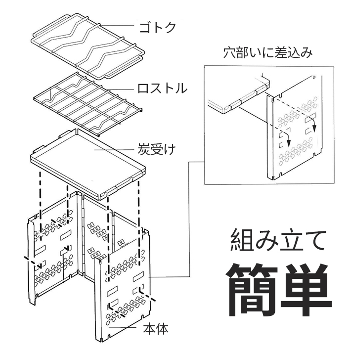 - 本体×1、炭受け×1、炭ストッパー×1、ゴトク×1、ロストル×1、収納袋×1